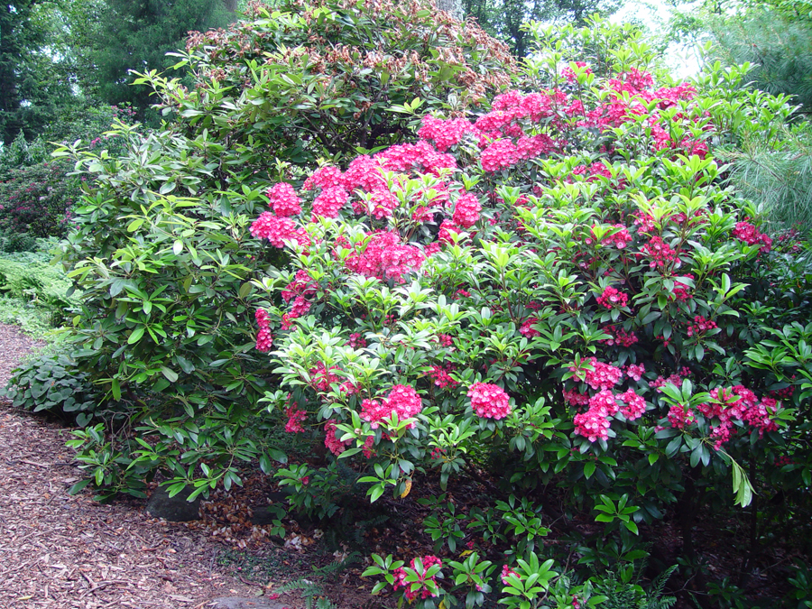 Кальмия — очень схожа с рододендронами, спектр цветения от белого до пурпурного.