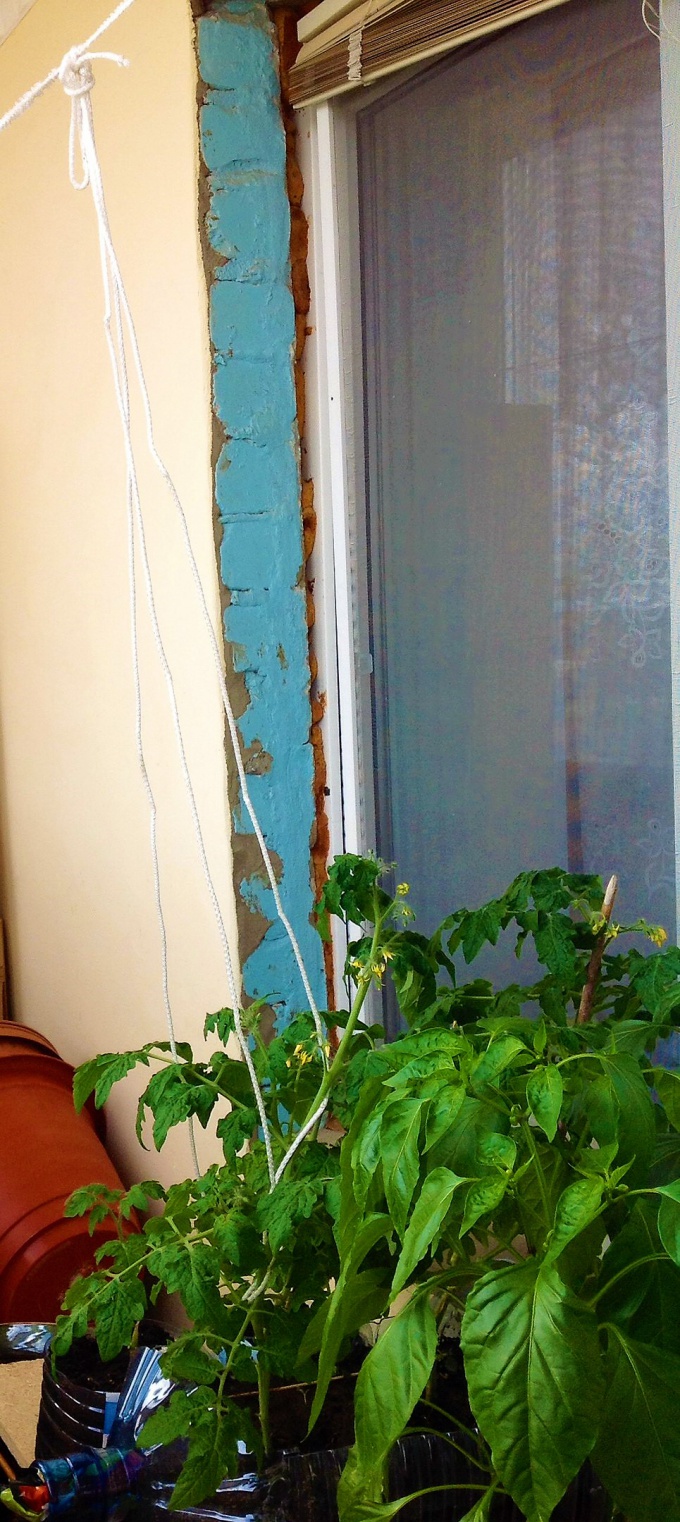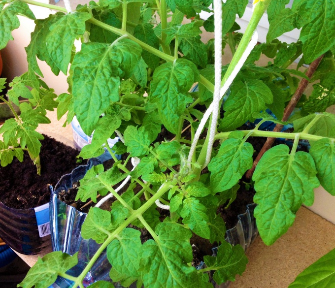 Первым способом я недавно воспользовалась на примере помидорки: мне не захотелось вставлять опору в землю, а показалось более разумным протянуть шнур через ствол и боковые побеги прямо к бельевой верёвке, которая проходила сверху: