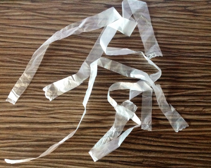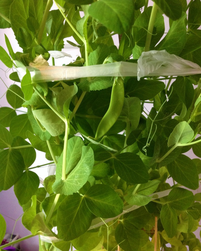 Для подвязки зелёного горошка шнур мне показался слишком грубым, поэтому я использовала ленточки, нарезанные из полиэтиленовых пакетиков: