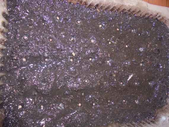 Высеваю бальзамин в пластиковые одноразовые поддоны. Грунт предварительно обильно смачиваю водой, далее быстренько делаю отверстия в мокрой земле. В ямки, которые образовались ложу по одному семечку. Вода тихонько всасывается и влечёт за собой семена. Семечко чуть проникает в грунт и так остаётся до прорастания.