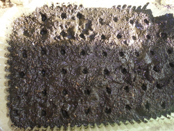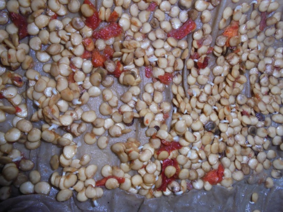 Грунт обильно поливаю и делаю углубления на расстоянии приблизительно 2 см друг от друга. Именно в такие отверстия и сею проклюнувшиеся семена перца. Как говорила моя бабушка «Сей в грязь — будешь князь». В сухую землю проклюнувшиеся семена совершенно опасно высевать, у меня уже был такой горький опыт, а вот в грязь то, что нужно.