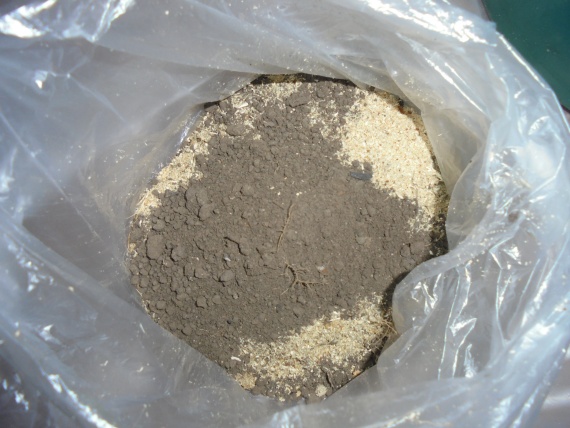 На дно пакета ложу совок грунта садового и совок опилок. В прошлые годы я практиковала только опилки, получалось очень хорошо, но в этом году с опилками проблема, вот и добавляю грунт.