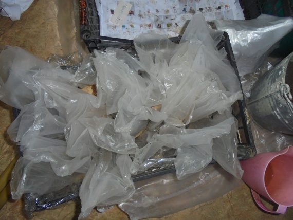 Далее идёт полив. В каждый пакет я заливаю приблизительно по 200 мл воды. Даю возможность воде полностью пропитать грунтовую смесь, и если этого не достаточно, то ещё доливаю. Перед проведением всей этой процедуры я подстилаю плёнку (на фото видно) так как в пакетиках отверстия и вода может чуть выливаться.