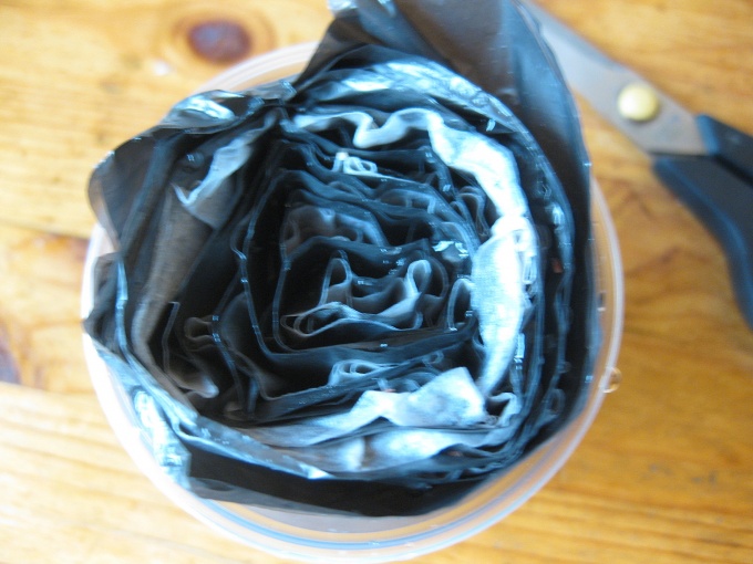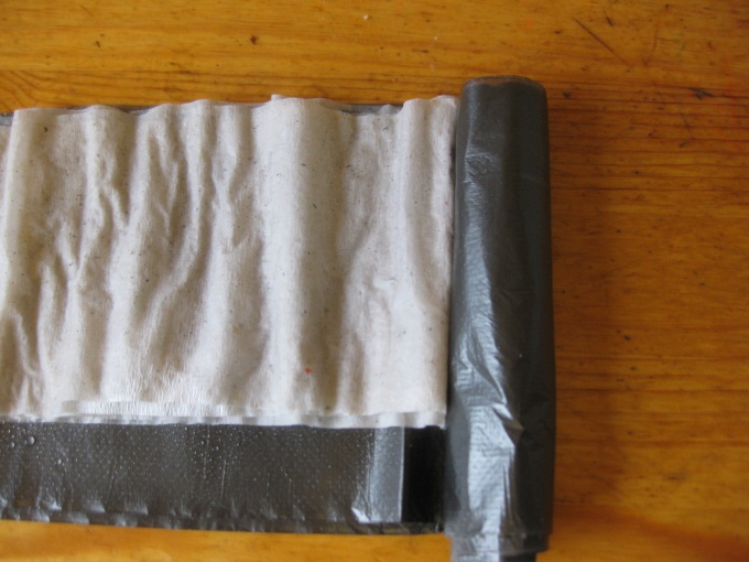• Берём рулончик мусорных пакетов, разворачиваем на необходимую длину (1,5 м – это рулончик, который умещается в контейнер диаметром 8-9 см), раскладываем сверху туалетную бумагу в 4-5 слоёв.