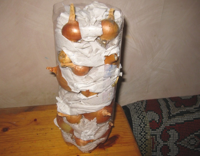 • Дальше на дно кладём несколько слоёв туалетной бумаги, потом начинаем выкладывать луковицы так, чтобы их макушки слегка выглядывали из отверстий, между ними не жалея забиваем туалетную бумагу, по ходу немного проливаем.