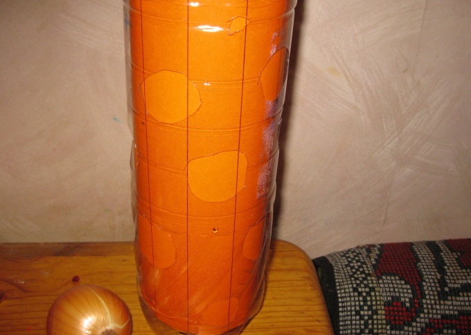 • Отбираем луковицы, опускаем несколько в бутылку, определяя, на какой высоте и расстоянии прорезать отверстия. Маркером делаем пометки в шахматном порядке.