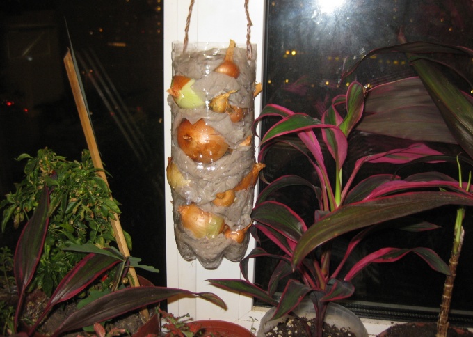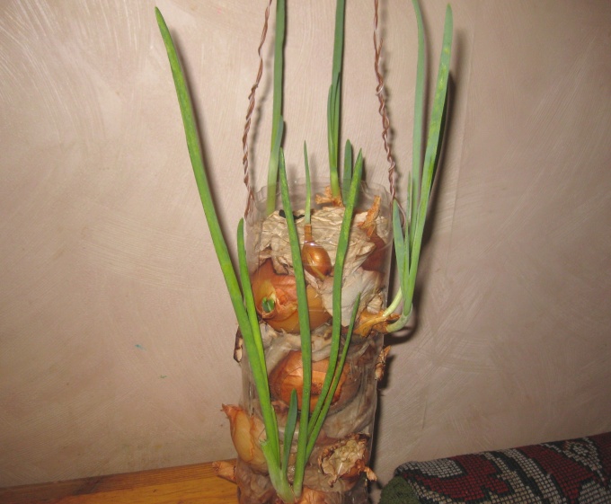 • Можно приделать к этой пирамиде ручку из проволоки, как для ведёрка. Так я и сделала, и до того момента, как луковки начали проклёвываться, вся конструкция висела на ручке окна, и не занимала на подоконнике никакого места.