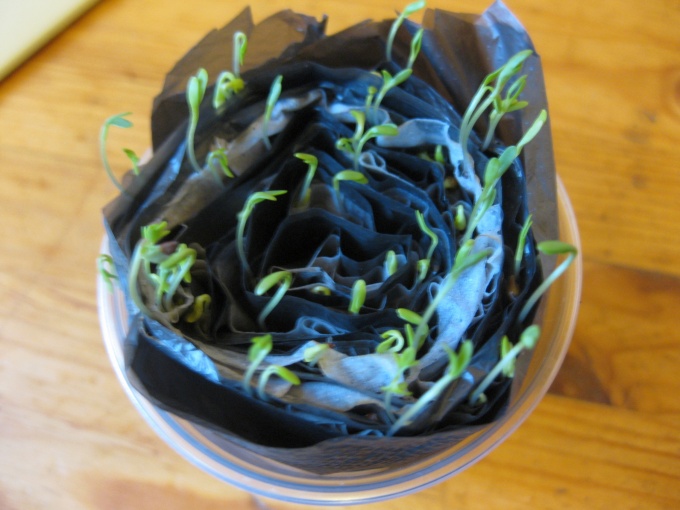 • Как только появятся ростки, их стоит ставить на досвечивание каждый день (можно даже под обычную настольную лампу), я первый раз этого не сделала сразу, и всходы успели очень вытянуться, это не криминально, т.к. стебельки тоже идут в еду, но под лампой выйдет букетик пышнее и зеленее.