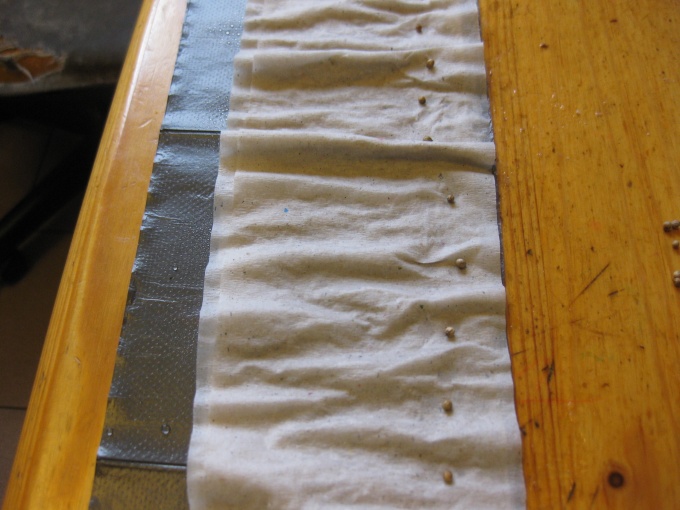 • Сверху опрыскиваем и раскладываем семена. Если это возможно, не чаще, чем через 1 – 1,5 см, т.к. прореживать всходы неудобно – они очень нежные.