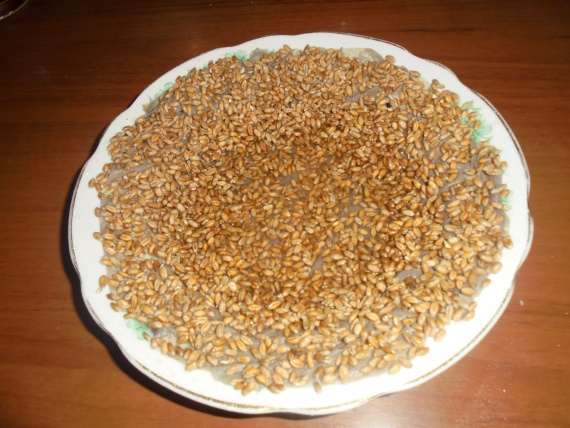 Засыпала зерном, я использую пшеницу. Смочила зерно из опрыскивателя водой.