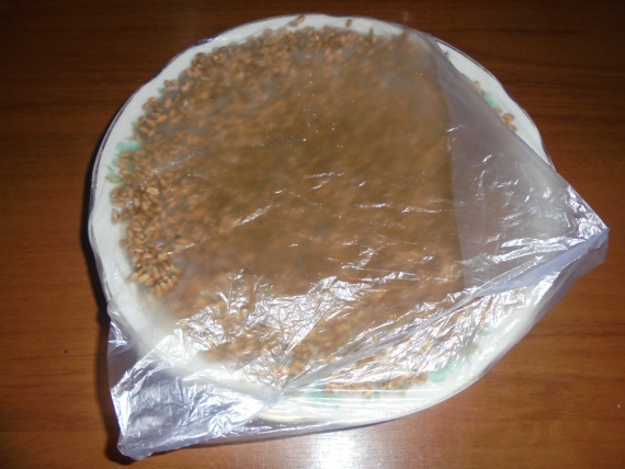 Тарелку с зерном засунула в полиэтиленовый пакет и поставила на подоконник.