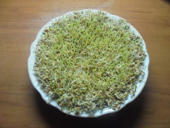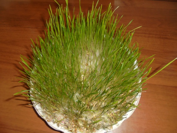 Первые несколько дней, когда зерно только начинает прорастать эта посудина может стоять в каком угодно месте, зерну ещё не нужен свет. А вот через 3-4 дня тарелочку ставлю на подоконник, теперь от количества света будет зависеть цвет нашего лужка. Если света будет не достаточно, лужок будет бледно зелёного цвета, и наверняка не станет украшением.