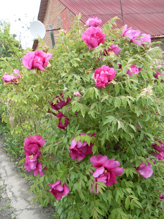 Впервые с древовидным пионом я познакомилась, проходя по улице не очень цивилизованной деревни. Меня поразил чудесный запах, исходивший из двора, заглянув за забор, я была поражена красотой цветов на кустике.