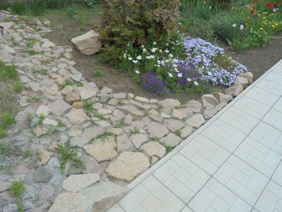В прошлом году мы задумали на границе места для парковки машины и цветника уложить камень. Камень был привезен заранее, поэтому препятствий к работе не было.