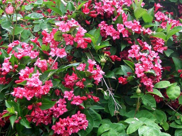 Вейгела — этот кустарник можно сформировать высоким и низким, широким и узким. Палитра её прелестных цветочков от белого до бордового, а подбор по срокам цветения обеспечит нам долго цветущий уголок. Из неё же можно создать и живую изгородь.