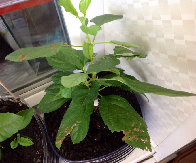 Так как подсолнух должен расти на солнечной стороне, то и земля, соответственно, высыхала на солнышке очень быстро, требуя частого полива. А на выходные я уехала в гости, забыв полить свой подсолнух достаточно обильно для 2-х дней. По приезду меня ждала вот такая картина: